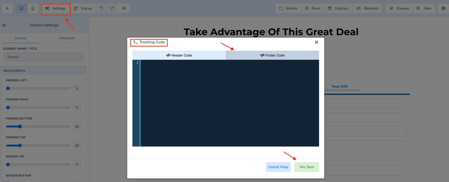 Clique em Configurações --> Colar em seu código de pixel na seção Código de acompanhamento principal.